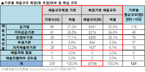 ¾Õ¼ ä¿ë°èȹÀÌ ÀÖ´Ù°í ¹àÈù 476°³ ±â°ü Áß »ó¼¼ÇÑ Ã¤¿ë±Ô¸ð±îÁö ¹àÈù ±â°üÀº ÃÑ 205°÷À¸·Î Ãß·ÁÁø´Ù(Ç¥2. Âü°í). À̸¦ °¨¾ÈÇÑ ±â°üº° Æò±Õ ä¿ë±Ô¸ð ºÐ¼® °á°ú¿¡¼´Â, 1°³ °ø±â¾÷ÀÌ Ã¤¿ëÇÏ°Ú´Ù°í ¹àÈù ½Å±Ô Á÷¿øÀÌ 115¸íÀ¸·Î °¡Àå ¸¹Àº °ÍÀ¸·Î ¹àÇôÁ³´Ù. À̾î ÁØÁ¤ºÎ±â°üÀÌ 76¸í, ±âŸ °ø°ø±â°üÀÌ 46¸í, ºÎ¼³±â°üÀÌ 37¸í µîÀ¸·Î ¸¹Àº ä¿ëÀ» ¿¹°íÇß´Ù. ÁöÀÚü Ã⿬±â°üÀÇ Æò±Õ ½Å±Ô ä¿ë ±Ô¸ð´Â 18¸íÀ¸·Î °¡Àå Àû¾ú´Ù.