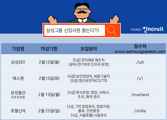 Ãë¾÷Æ÷ÅÐ ÀÎÅ©·çÆ®(www.incruit.com ´ëÇ¥ ¼¹Ì¿µ)°¡ 12ÀÏ ¹ßÇ¥ÇÑ ³»¿ë¿¡ µû¸£¸é, Áö³ 1¿ù 30ÀÏ 5±Þ ½ÅÀÔ»ç¿ø ä¿ëÀ» ½ÃÀÛÇÑ »ï¼ºSDI¸¦ ÇʵηΠ¿¡½º¿ø, »ï¼º¹°»ê, È£ÅڽŶó µî »ï¼ºÀÇ ÁÖ·Â °è¿»çµéÀÌ 4, 5±Þ ½ÅÀÔ»ç¿øÀ» ¼±¹ß ÁßÀÌ´Ù.