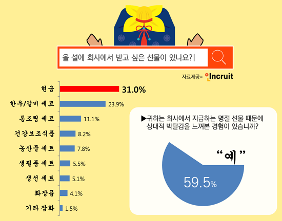 Ãë¾÷Æ÷ÅÐ ÀÎÅ©·çÆ®(´ëÇ¥ ¼¹Ì¿µ www.incruit.com) ¼³¹®Á¶»ç °á°ú, Á÷ÀåÀÎÀÌ °¡Àå ¹Þ°í ½Í¾îÇÏ´Â ¼³ ¼±¹° 1À§¿¡ Çö±Ý ¶Ç´Â »óǰ±ÇÀÌ ¿Ã¶ú´Ù.