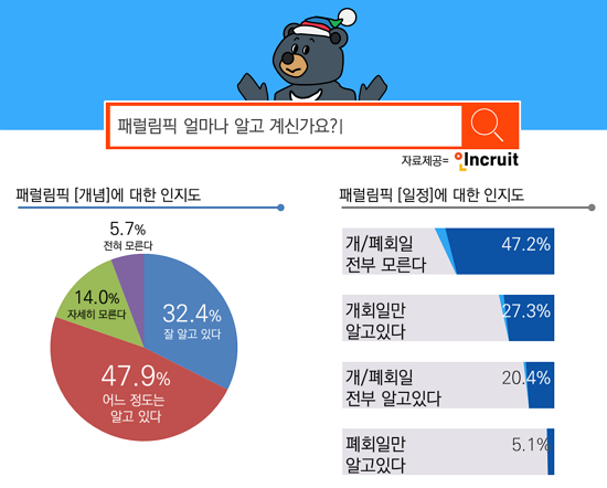 2018 Æò⵿°è¿Ã¸²ÇÈ¿¡¼ ¿ì¸®³ª¶ó´Â ÃÖÁ¾¼øÀ§ 7À§¸¦ Â÷ÁöÇÏ¸ç ¼º°øÀûÀ¸·Î ¸·À» ³»·È´Ù. ±×¸®°í ¿À´Ã ¿ÀÈÄ 8½Ã ¡®2018 Æòâ µ¿°èÆÐ·²¸²ÇÈ¡¯ÀÇ °³¸·½ÄÀÌ ¿¸°´Ù. ±×·¯³ª Ãë¾÷Æ÷ÅÐ ÀÎÅ©·çÆ®(www.incruit.com ´ëÇ¥ ¼¹Ì¿µ)°¡ ½ÃÀå Á¶»ç±â°ü µÎÀÕ¼º£ÀÌ¿Í °øµ¿ ÁøÇàÇÑ ¼³¹®Á¶»ç °á°ú¿¡ µû¸£¸é, Âü¿©ÀÚ 2¸í Áß 1¸íÀº Á¤È®ÇÑ ´ëȸÀÏÁ¤À» ¸ð¸£°í ÀÖÀ¸¸ç ¾Æ¿¹ °ü½ÉÀÌ ¾ø´Â °æ¿ìµµ 11.4%¿¡ ´ÞÇÏ´Â °ÍÀ¸·Î ¹àÇôÁ³´Ù.