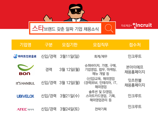 Çö´ë¡¤±â¾ÆÂ÷³ª LGÀüÀÚ, CJ µî ÁÖ¿ä ´ë±â¾÷µéÀÌ °øÃ¤¿¡ ³ª¼´Â 3¿ùÀÌ´Ù. ½ÅÀÔ±¸Á÷ÀÚµéÀÇ ´ë°Å Áö¿øÀÌ ¿¹»óµÇ´Â °¡¿îµ¥, ±â¾÷¸íÀº ´Ù¼Ò »ý¼ÒÇÒ ¼ö ÀÖÁö¸¸ À̸§¸¸ µéÀ¸¸é ¾Æ´Â À¯¸íºê·£µå¸¦ º¸À¯ÇÑ Áß°ß¡¤Áß¼Ò±â¾÷¿¡¼µµ ½ÅÀÔä¿ë¿¡ ³ª¼¹´Ù. ÇÏÀÌÆ®Áø·áÀ½·á(¼®¼ö, Ç»¸®½º ¿Ü), º»¾ÆÀÌ¿¡ÇÁ (º»Á×, º»µµ½Ã¶ô), ÀÕÃ÷ÇÑºÒ (ÀÕÃ÷½ºÅ² ¿Ü) µîÀÌ ´ëÇ¥ÀûÀ¸·Î, ÀÎÅ©·çÆ®(´ëÇ¥ ¼¹Ì¿µ www.incruit.com)°¡ ÀÌµé ±â¾÷ÀÇ ½ÅÀÔ Ã¤¿ë¼Ò½ÄÀ» ÀüÇÑ´Ù.