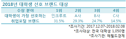 ÀÎÅ©·çÆ®´Â ¿ÃÇØ ¼±È£µµÁ¶»ç¿¡¼ 31.5%¸¦ ±â·ÏÇϸç Ãë¾÷Æ÷ÅÐ ºê·£µå ºÎ¹® 1À§¸¦ ±â·ÏÇß´Ù. ÀÌ¾î¼ A»ç°¡ 29.3%·Î 2À§¸¦, B»ç´Â 24.7%·Î 3À§¸¦, C»ç´Â 14.5%·Î 4À§¿¡ ¿Ã¶ú´Ù. 1À§ ÀÎÅ©·çÆ®´Â 2À§ »ç¿Í´Â 2.2%P Â÷, 4À§ »ç¿Í´Â ¹«·Á 2¹è ÀÌ»óÀÇ µæÇ¥À²À» ¹ú·È´Ù. À̹ø ¼ö»óÀº Ãë¾÷Æ÷ÅÐÀ» ÀÌ¿ëÇÏ´Â Àü±¹ÀÇ ´ëÇлý 1,050¸íÀ» ´ë»óÀ¸·Î ÇÏ¿©, Áö³ÇØ 12¿ù 7ÀϺÎÅÍ ¿ÃÇØ 2¿ù 8ÀϱîÁö ±âÃÊÁ¶»ç ¹× ¼³¹®Á¶»ç¸¦ °ÅÄ£ µÚ Àü¹®°¡¿Í ±âÀÚ´Ü Æò°¡ ½É»ç¸¦ °ÅÄ£ °á°ú´Ù.