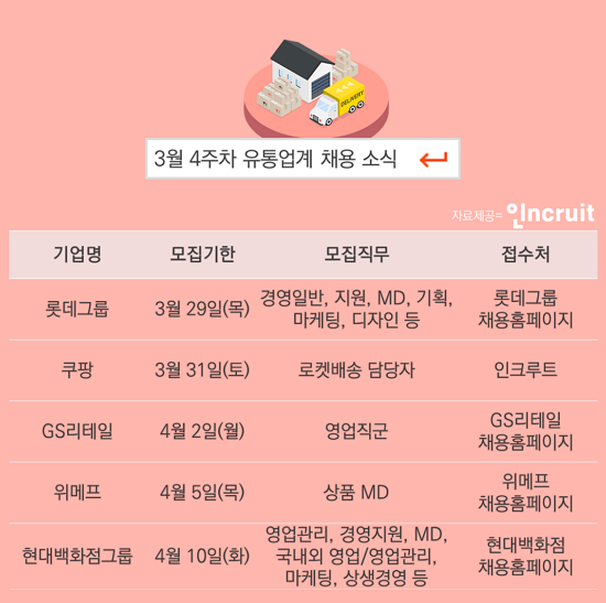 ±×°£ ÀÏÀÚ¸® âÃâÀÇ ÀÏµî°ø½Å ¿ªÇÒÀ» ÇØ¿Â À¯Åë¾÷ü, ÇÏÁö¸¸ ¿ÃÇØ ÃÖÀúÀÓ±Ý Àλó°ú ±Ù¹«½Ã°£ ´ÜÃàÀ¸·Î Á÷°ÝŸ¸¦ ÀÔ¾ú´Ù. ƯÈ÷ ´ëÇü À¯Åë»çÀÇ °æ¿ì ½Å±Ô ÃâÁ¡ ±ÔÁ¦ µîÀ¸·Î ¾÷Ȳ ¿ª½Ã À§ÃàµÈ »óȲ. ±×·³¿¡µµ ½ÅÀÔ»ç¿ø ä¿ëÀÇÁö¸¦ µå·¯³»¸ç ÀÏÀÚ¸® âÃâ¿¡ Èû¾²°í ÀÖ´Ù. Ãë¾÷Æ÷ÅÐ ÀÎÅ©·çÆ®(www.incruit.com ´ëÇ¥ ¼¹Ì¿µ)°¡ ·Ôµ¥±×·ì, Çö´ë¹éÈÁ¡, GS¸®Å×ÀÏ, À§¸ÞÇÁ, ÄíÆÎ µî ÁÖ¿ä À¯Åë»çµéÀÇ ½ÅÀÔ Ã¤¿ë ¼Ò½ÄÀ» ÀüÇÑ´Ù.